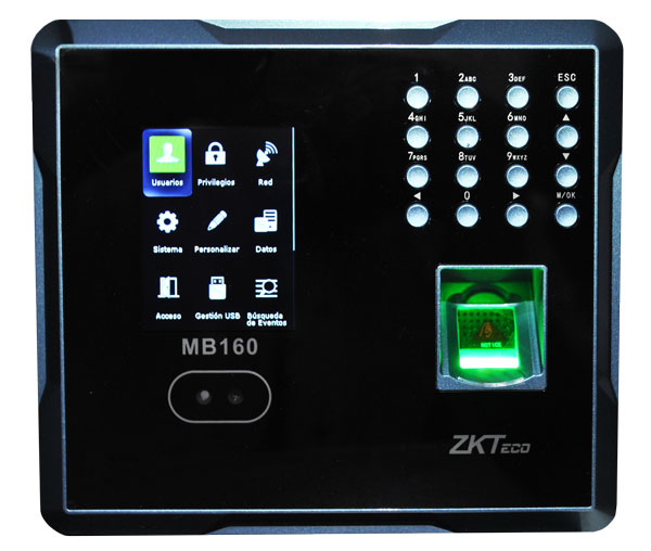 Reloj Checador biométrico terminal de control de acceso y asistencia facial zkteco MB160 con lector biométrico de huella digital y rostros para aplicaciones de control de acceso. MB160 ofrece flexibilidad para ser instalado de manera autónoma. Cuenta con interfaz TCP/IP y para una fácil conexión.